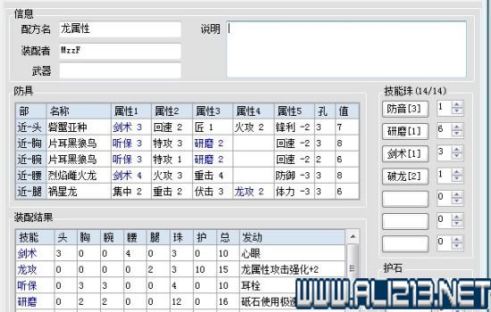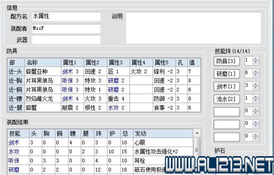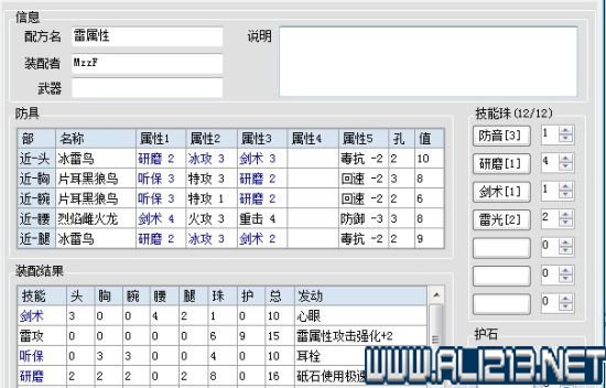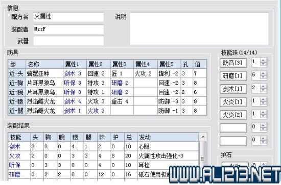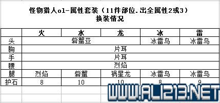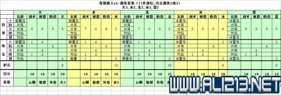 看了不少论坛,总结了前辈们的一系列属性套装,研究了一套用11件装备,就可以做出 火+3、水+2、龙+2、冰+3、雷+2的套装。