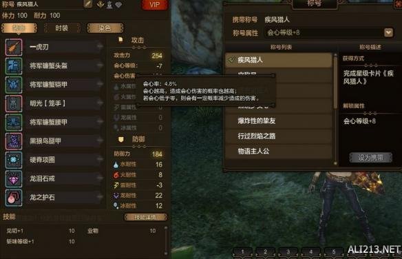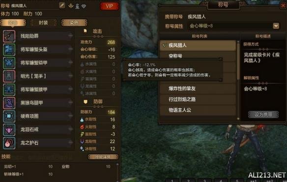 6.通常配这一套装备的一虎刃会选择传说之人称号让会心值正好为0,但为了一定的公平性,都选择了疾风猎人称号。