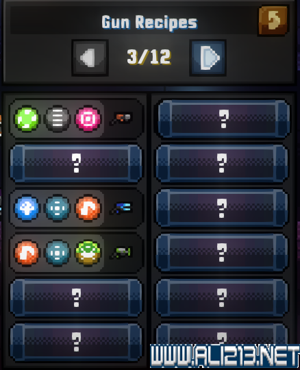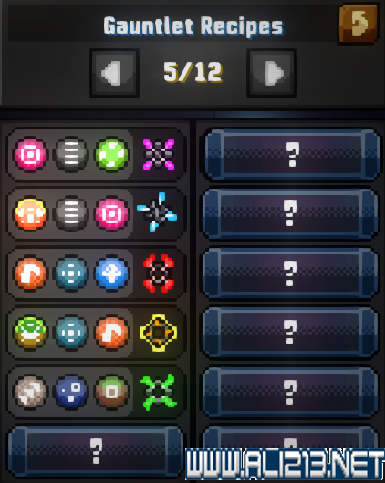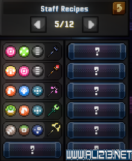 紫色的是类似圆环的武器吧 翻译是说的是魔法拳套 攻击时会释放一个魔法弹 像素游戏这种攻击类型基本大家都见过 但是最坑爹的也是这个 生成的位置不确定 攻速还慢 特别是打那种长长的怪 多判定范围的慢的要命 不推荐使用