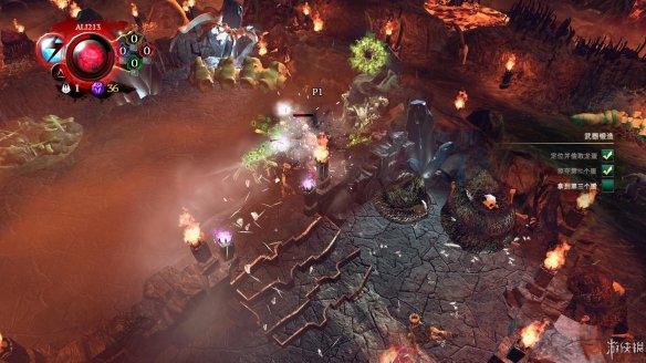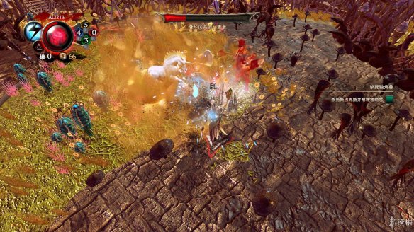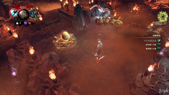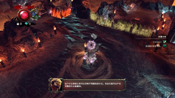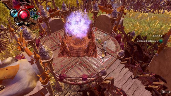 11,向左沿着打开的路,来到下一个区域,消灭这里不断刷出的精灵。敌人的数量和波次会比较多,我们最后依靠着里面的棕色仆从喷泉,不断的刷新仆从来抵御出现的敌人。