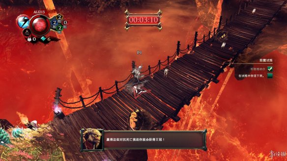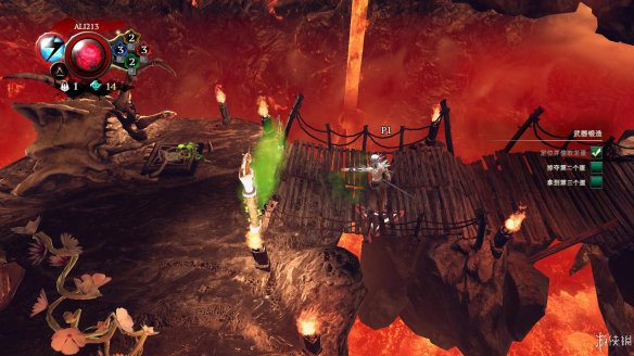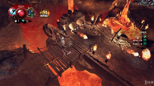 8,接着往前走,在桥上触发新的技能可以使用,用数字键2使用强大的特殊攻击消灭前方的士兵。特殊攻击有较长的CD时间,玩家可以在血量的左边查看。