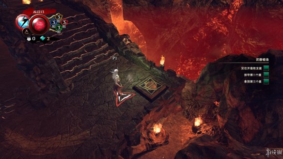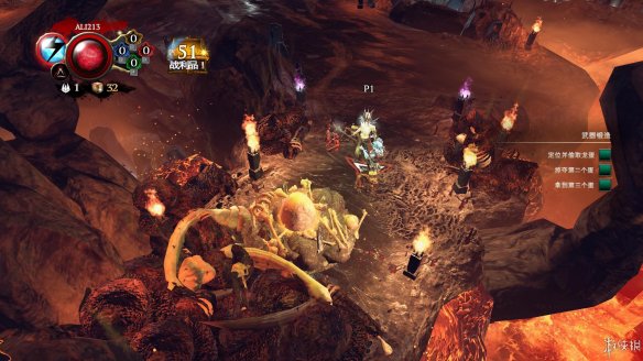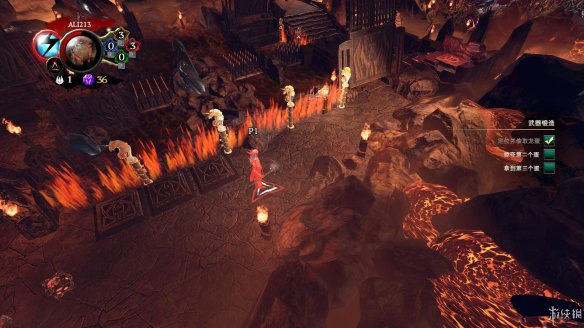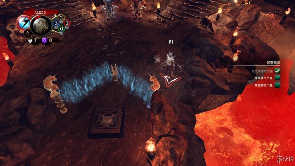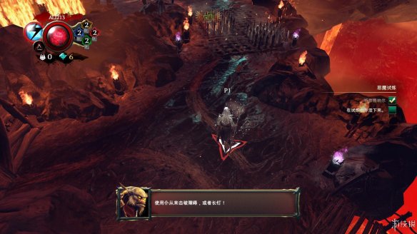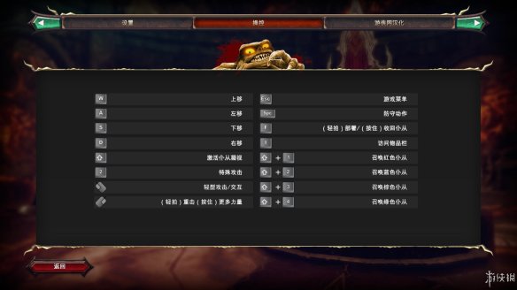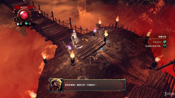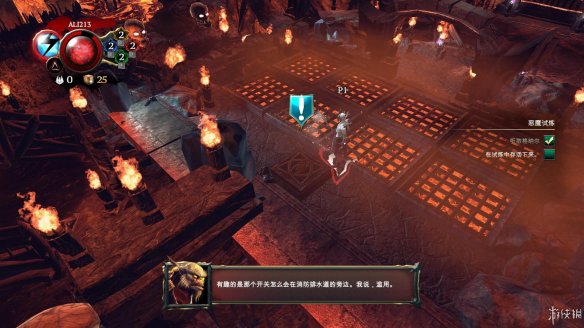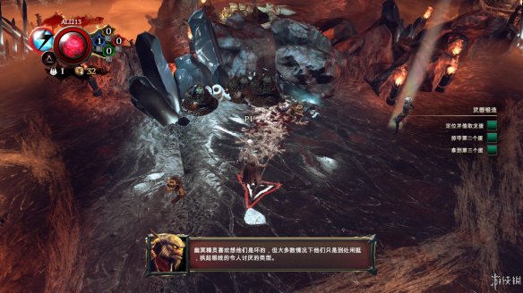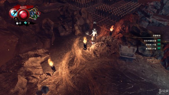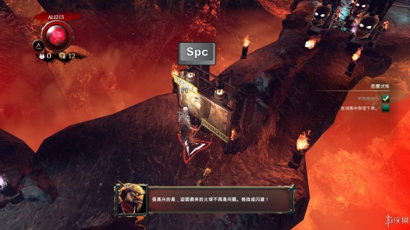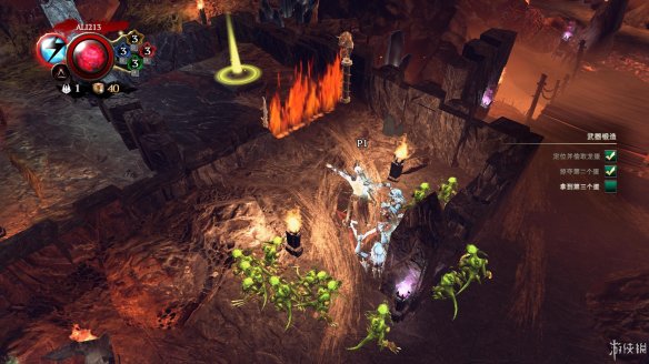 4,继续向前能遇到喷火的骷髅,这里只要使用空格键开启防御模式就可以了。每个英雄的防御模式不同,黑暗精灵王子的防御模式是升起一面盾牌,鼠标控制盾牌的方向,抵挡前方的攻击就可以了。
