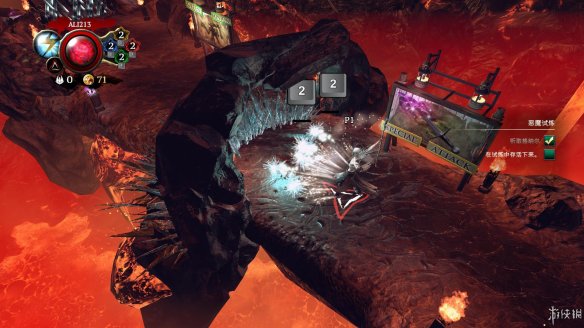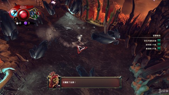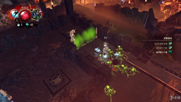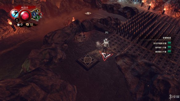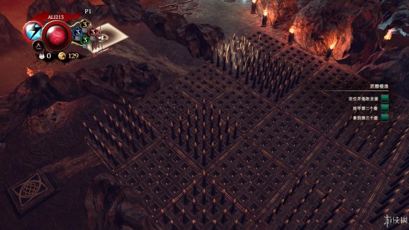来到红色光幕的地方,指派红色仆从去激活下图右上角的开关,在仆从经过上方尖刺的时候,从左到右依次踩开关,去帮助仆从关闭尖刺陷阱。