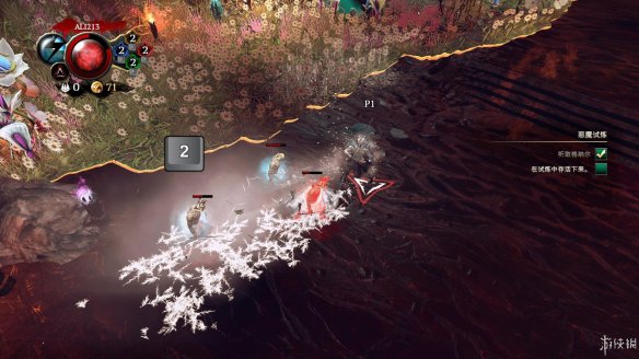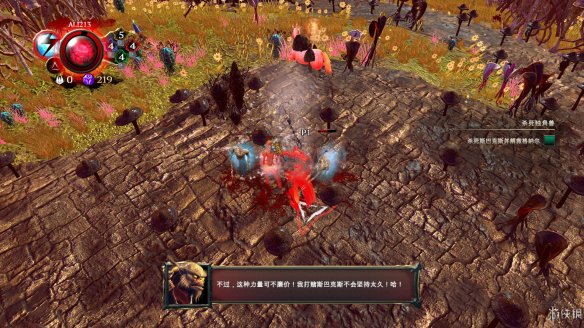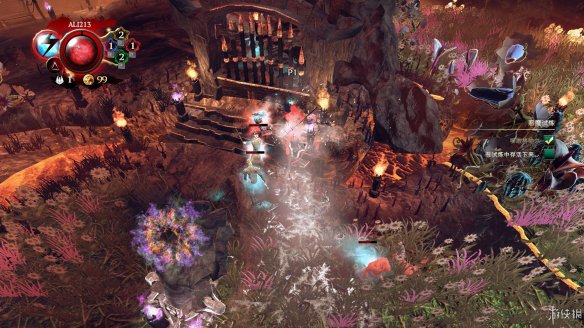 11,继续前进来到有黄金疫的地方,道路的两旁都开满了鲜花。在这里击退几波敌人,不要释放过多的随从,自己打就可以了,因为随从碰到鲜花之后,就被同化便Q了。人物走到鲜花土壤上也会持续的受到伤害。