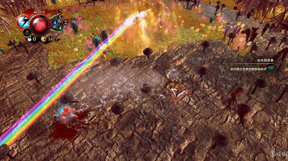3,接着独角兽会召唤2个持盾的行善者,和释放彩虹光芒。行善者短时间内较难清掉,那么就带着他们绕着独角兽跑,通过蓄力的右击来消灭。攻击直至独角兽死亡。