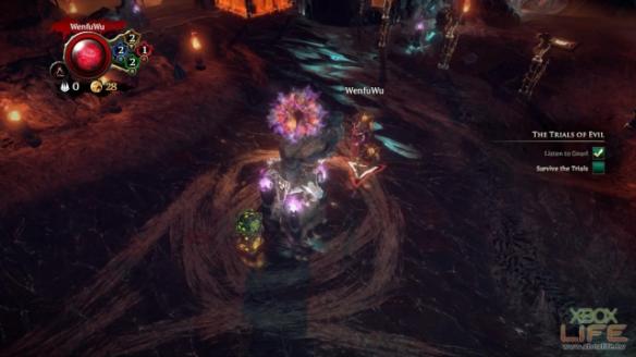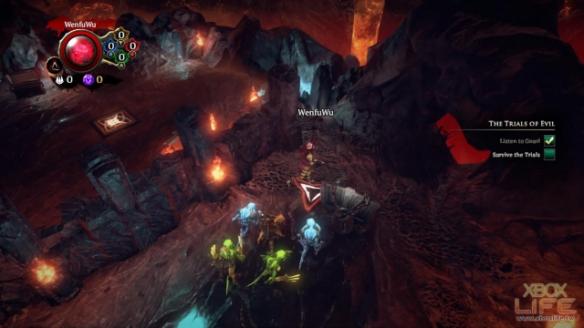 以上提到的不但是故事设定、也是这个游戏的基本,如何利用小鬼应付敌人、解除机关将会是这款游戏的关键。或许有玩家会担心这种暗黑破坏神类型的动作角色扮演光操纵自己的角色都来不及了哪有力气去管小鬼。这点请不用担心,在玩家选完角色后会准备一段教学关卡,让玩家从左模拟的移动、右模拟的闪躲、轻重攻击与小鬼的运用都能弄得一清二楚,同时也会发现这游戏的操作其实是非常简单。首先自身角色除了基本移动攻击外,就是特殊技跟召唤小鬼,特殊技可以想成解危用的强力绝招,威力虽强却不能经常使用。而小鬼的操作就只有召唤跟指示两种,召唤就是叫出小鬼,条件是左上角血量旁边的魔力方块有 1 以上时,只要保有该颜色魔力方块,就能消耗 1 颗召唤出该颜色的小鬼来为玩家出生入死。