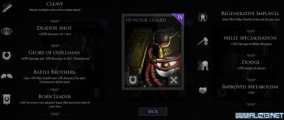 能力:裂开(使用近战武器攻击多个敌人)、神枪射击(1回合+100%准成)、guilliman的荣耀(所有极限战士,+40%伤害以及-10%准成)、天生领袖(当你的回合开始时,每两个毗邻的宇宙军队+1AP)、恢复剂(直至回合结束,恢复总血量的5%)、近战专精(使用近战武器+15%伤害)、