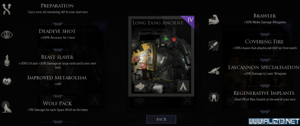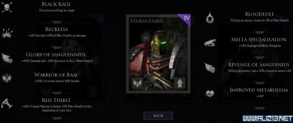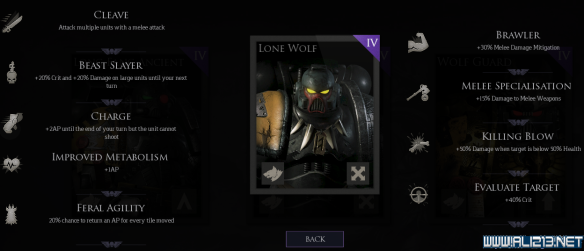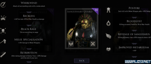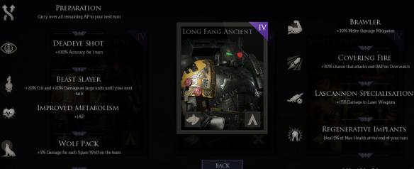 能力:黑色愤怒(射程覆盖所有范围)、鲁莽(+1AP,但减少总血量20%,这当作是受到伤害)、leman russ的荣耀(+40%伤害以及-10%宇宙之狼的准成)、太阳神的战士(+当血量低于50%,+30%致命一击)、红色饥渴(如果宇宙军队在你的回合开始时血量低于20%,+1AP)、杀戮欲望(杀死一名敌人恢复5%血量)、热熔枪专精(使用热熔枪武器+15%伤害)、血色复仇(杀死一名敌人有20%的机会恢复1AP)、新陈代谢(+1AP)