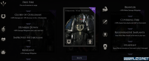 能力:自由开火(向范围内的所有敌人开火)、guilliman的荣耀(所有极限战士,+40%伤害以及-10%准成)、沉潜待发(直至你的下一回合,+90%伤害减缓)、弹性活力(+15%伤害减缓)、好斗(+30%近战伤害减缓)、掩护射击(在掩护状态下,+30%机会进行攻击是消耗0AP)、