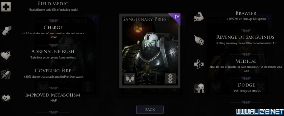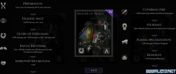 能力:准备(保留这个回合剩余的AP直到下一个回合)、神枪射击(1回合+100%准成)、guilliman的荣耀(所有极限战士,+40%伤害以及-10%准成)、战场兄弟(队伍中的每位极限战士,获得+5%最大血量以及+5%准程度)、新陈代谢(+1AP)、掩护射击(在掩护状态下,+30%机会进行攻击是消耗0AP)、
