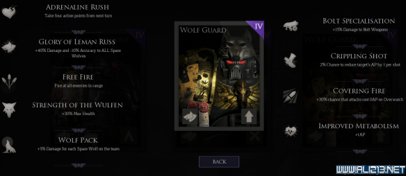 能力:肾上腺素(每回合获得4AP)、leman russ的荣耀(+40%伤害以及-10%宇宙之狼的准成)、自由开火(向范围内的所有敌人开火)、wulfen的力量(+30%最大血量)、狼群战术(每个位置中的狼+5%伤害)、冲锋枪专精(使用冲锋枪武器+15%伤害)、致残射击(每一枪+2%机会降低敌人的AP)、掩护射击(在掩护状态下,+30%机会进行攻击是消耗0AP)、新陈代谢(+1AP)