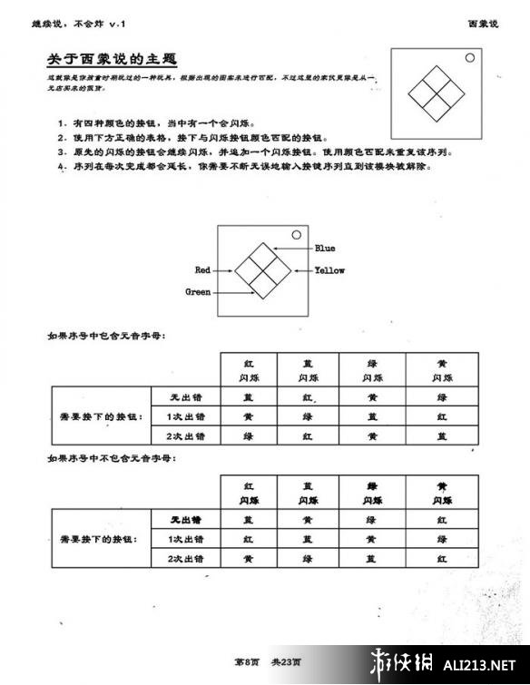 西蒙说尤其考验耐心和细心,解决的过程一定不要忘了:1.确认序号有无元音字母。2.确认有无出错记录,这个模块最容易让玩家出现连环错了=,=