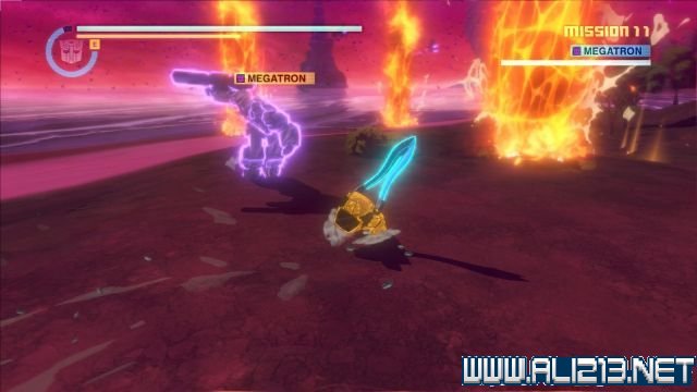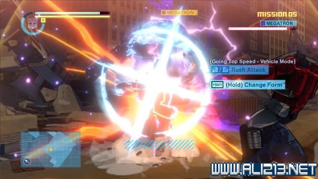 step7.这时候要面对带盾的威震天,切换至汽车模样,然后直接撞向威震天就可以破他的盾,接着就可以攻击他。