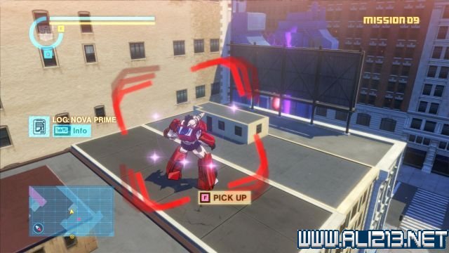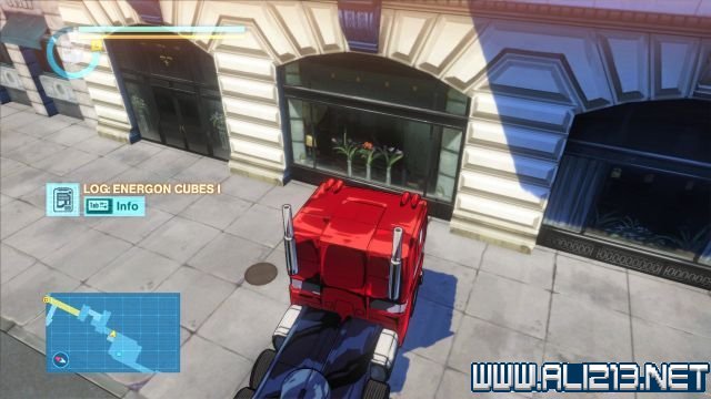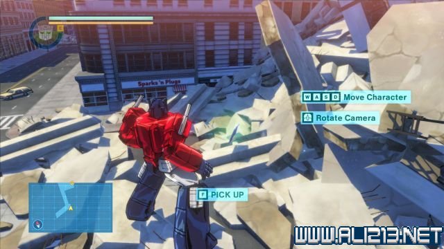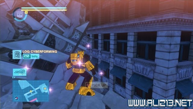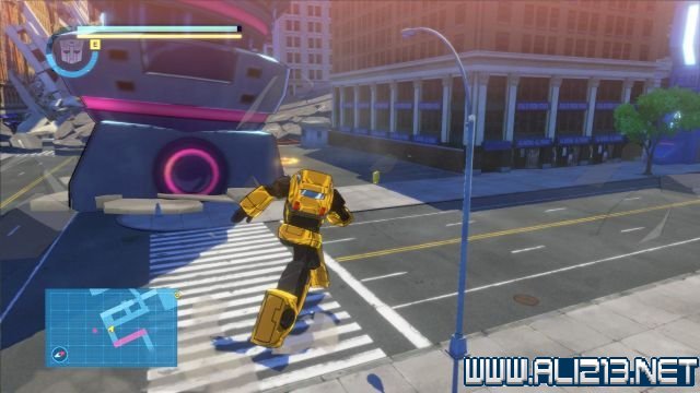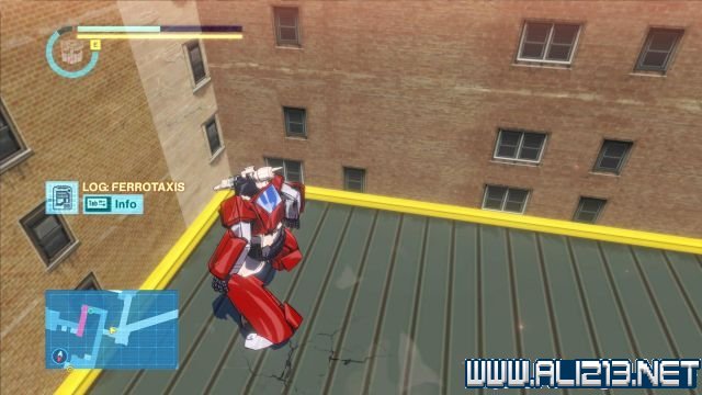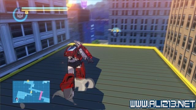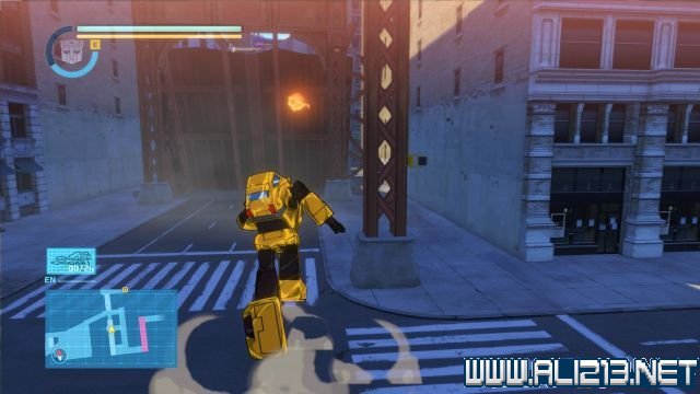 step3.跳上北面黄色的屋顶可以翻至另一个区域,此时可以看见大黄蜂在马路上等候着擎天柱。