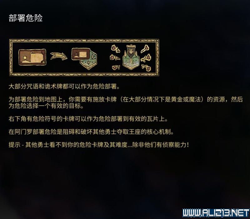 放置于地图任意地块,除非有侦查卡,其他英雄无法看到你布置的冒险。
