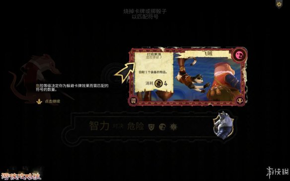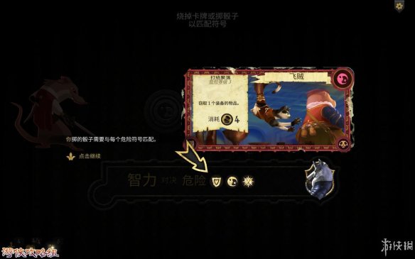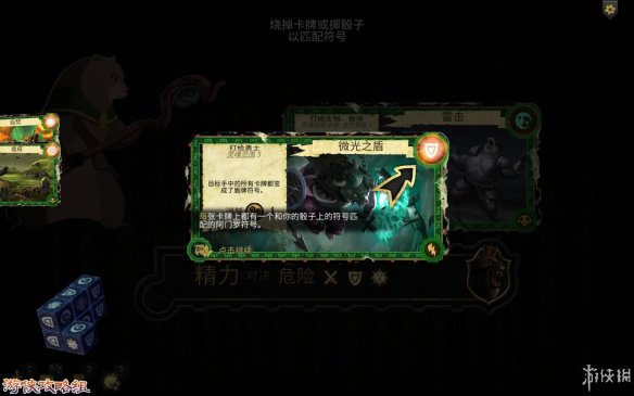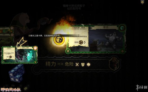 挑战陷阱:通过烧毁卡牌上的符号和投骰子来匹配下方的危险符号。成功后,就算挑战成功。