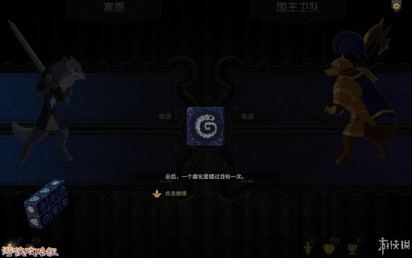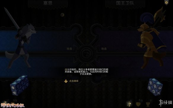 战斗开始:每一场战斗的开始,敌方与我方都要展示装备,追随者和能力。并且此时的骰子无法进行更换。攻击牌数高于敌人防御牌数时,就能对敌人造成伤害。