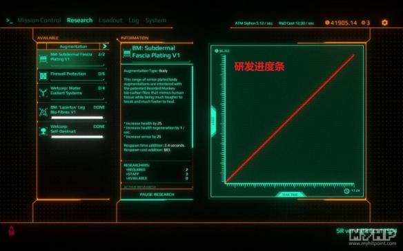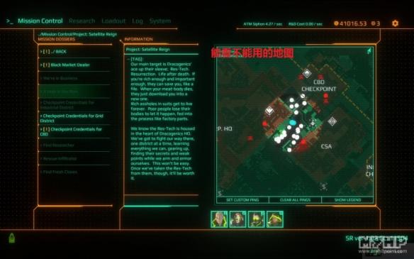 玩家起初是没有这些装备的,要先窃取敌方的“原型”,或者直接从黑市里买,然后加以研究来获得批量制造能力。这样通过探索和入侵来强化自己,算是在保证自由度的基础上鼓励玩家多做支线任务。研究需要一定金钱和时间,如果想加速研究的话就得多花成倍的钱,在菜单界面还可以通过坐标图来查看研究进度。而游戏中金钱的来源也很特别,就是在城市各地的ATM机里植入芯片,它们就会像你的投资项目一样提供源源不断的金钱。