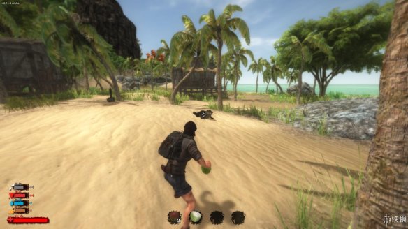 第一种,进游戏就可以看见的椰树,它们比较集中的生长在海边的沙滩上,鼠标右键的状态下,点击左键不断的摇动它,待到摇树的图标变成红色的时候,会有椰果和椰树叶掉下来,椰果+切割(前提是你要有一把小刀)能够制作成椰汁,椰汁能够用来恢复口渴值。