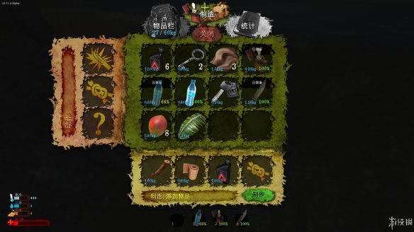 i键呼出背包界面,这里的四个按钮别分为物品栏,制造,统计,关闭