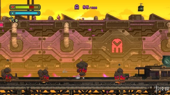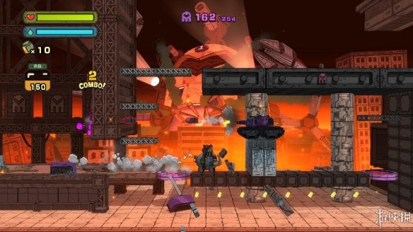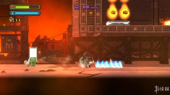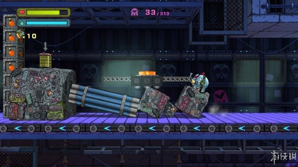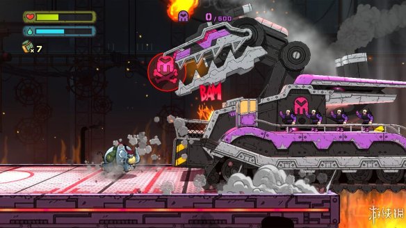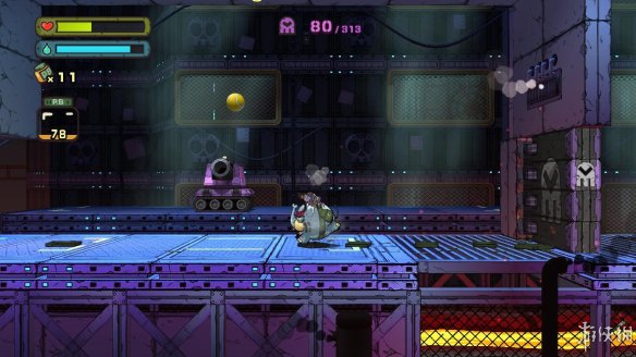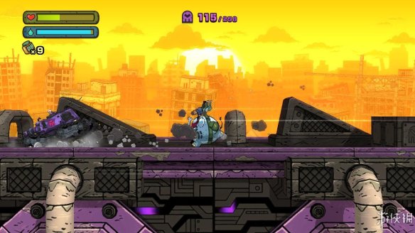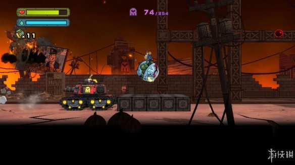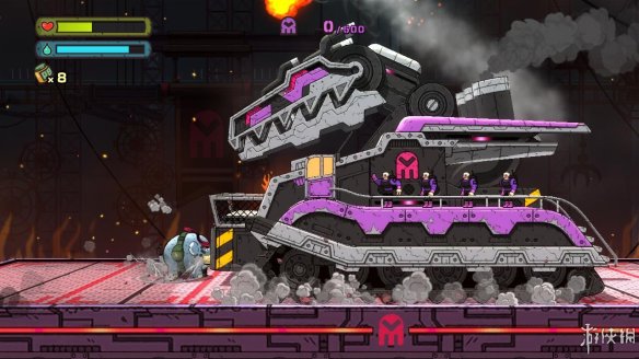 路上会有拦路的坦克,这个比较难对付,跳跃一次,躲开它的一发炮弹,撞击一次,然后再跳跃一次躲开炮弹,再撞击一次,撞击两次之后坦克会开始冲刺,先避其锋芒,从它头上跳至身后,然后撞击解决它。