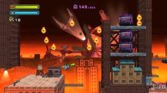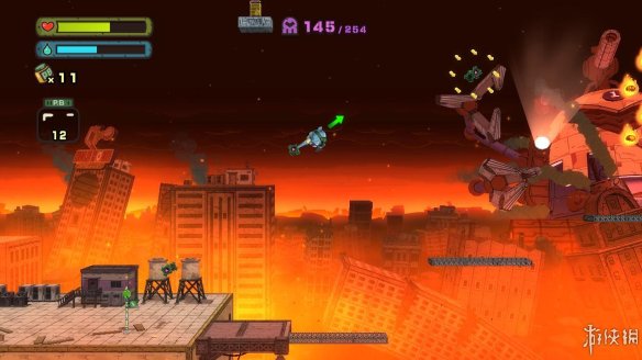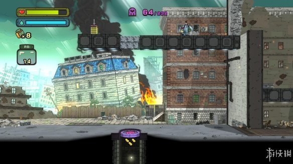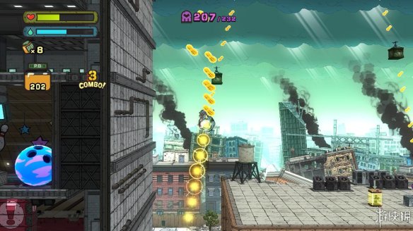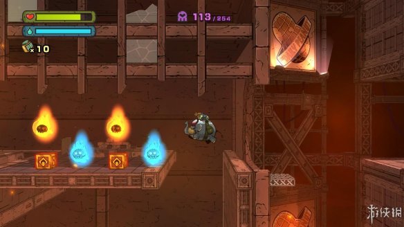不断的在楼层间隔中飞跃,此处也是一样,控制好方向能够不碰触到任何火球完美的到达对岸,然后从对面的楼顶,一直撞到底层。