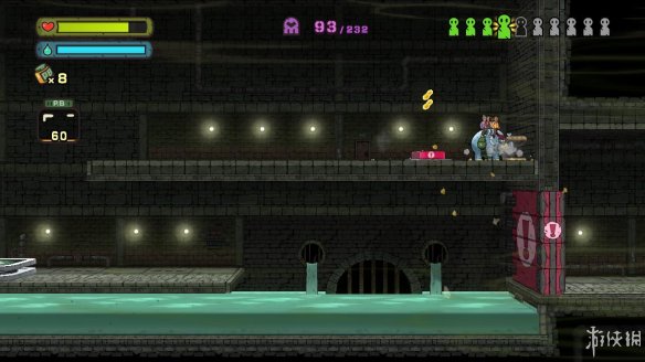沿着下水道的水路往前走,干掉路上的杂兵,不久后发现有一扇红门挡住了去路,我们返回跳上台阶,干掉台阶上的掷雷的小兵,来到图中红色按钮处,下移+跳跃撞击按钮,能够打开红门,继续前行。