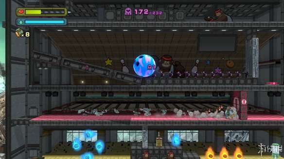 来到下方,这里我们一边撞一边前行即可,道路的破坏会导致上方道路坍塌,滚动的巨大保龄球一路碾压敌方杂兵,最后到达红色按钮处为我们开门。最下面一层,先到图右下角处充满水,然后一边洒水,一边前行,红色的火球能一次性熄灭,蓝色的火球熄灭后一小段时间会复燃,快速通过此处。