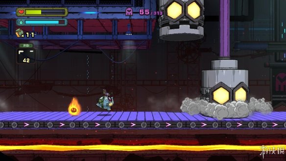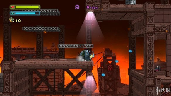 到达下方后先向左边走,左边的尽头有被困人员可以救,然后向右,不断砸下的巨大铁锤拦住去路,控制好落锤的时间间隔,小心通过,被砸上一次,直接就是一条血。