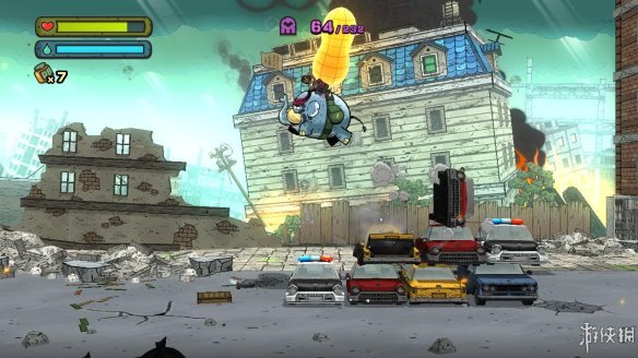 来到道路上有很多车辆组成的路障时,这里稍微停一下,在车辆的上方有一个巨大的花生,不要错过,300个花生=一条生命,尽量的收集。只用跳跃键跳上车辆的顶部,拿到花生,之后再撞毁车辆,继续前进。