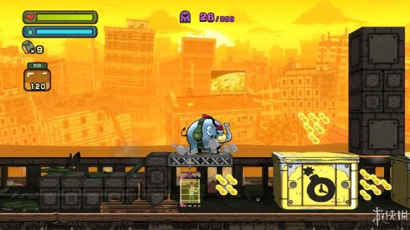 在这个关卡,坏象踏上了疾驰的列车,向前奔走,会发现有一个黄色的巨大铁箱挡住了去路,首先解救脚下了人员,然后撞击箱子一次,箱子会开始闪烁,躲到一边,等箱子爆炸后,继续前行。