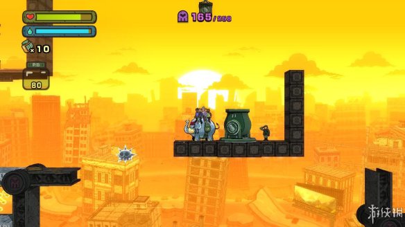 终于坏象来到了城市中心,敌人的内部,这里似乎是一个巨大的工厂。沿途用上移+冲撞干掉几只飞在空中的小机械,来到下方,这里从右边会不断传过来方形的压缩块,借助这些压缩块,跳上台子,撞击按钮,打开前面的门,自然带上路上的被困人员。
