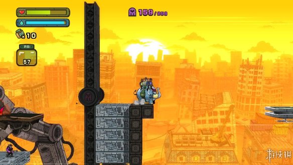 下方会遇到本关卡的一个小BOSS,是一个类人型的机器人。打这个机器人一味的蛮撞是不起效果的。首先拉开距离,机器人会沿着地面放一到两个能量波,跳跃躲过,然后机器人会起跳,我们抓准时间,在机器人起跳的一瞬间冲刺至其身后,然后使用撞击攻击。按此方法攻击三次之后,解决这个小BOSS。之后同样撞倒后面的铜像,完成本关卡。