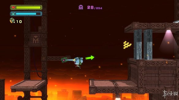 坏象乘着列车一路杀到第二座城市,撞开障碍物,来到第一处机关,这里我们需要利用这个挂钩来飞跃到远处的高台。跳跃至挂钩,挂钩开始旋转,把握好跳跃的时机来到上方的高台。