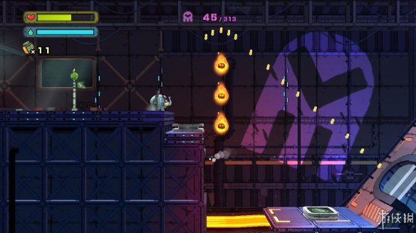 同样利用传送带上的压缩块跳上弹跳器,越过火墙到达对岸,来到图中位置,继续利用弹跳器,越过火墙,沿着对面弯曲的通道一直向下。