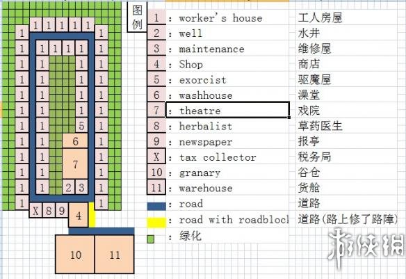 1.按照上图布局,修建1,2,3,4,X,10,房屋升级到2级,然后修建食物生产建筑并用道路连接到10,