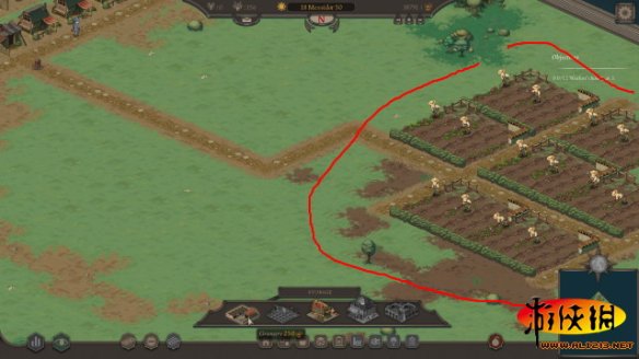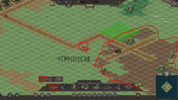红色圈选的地方为可种田区域,可放置田地显示绿色,不可放置显示红色