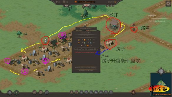 有水井会有人沿着路送水(黄线),每经过的房子满足条件就会升级,图片上不同粉色数字代表房子发展状况,必需品要盖建筑物收集。