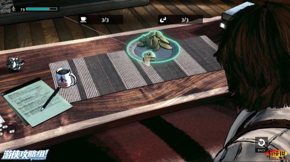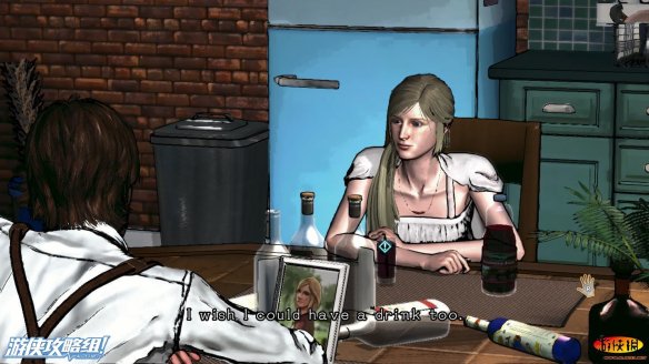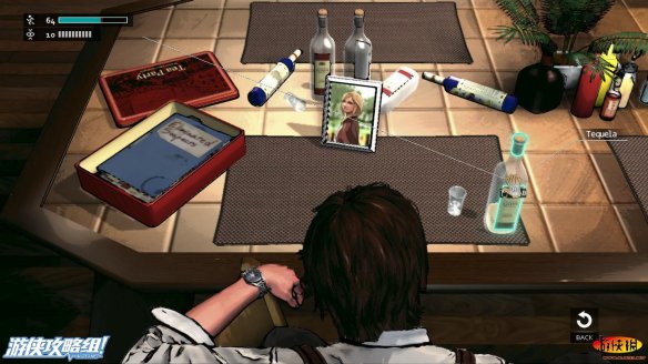 在酒桌上,有一本本子,有一个相片框,还有一杯酒,男主拿起酒喝完之后,还需要我们的进行qte来帅气的盖下酒杯。