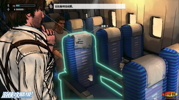 过道被飞机上的手推车挡住,只能先在手推车之前进行一些寻找,在放行李箱的里面能够找到一些回复用品,而在观察座椅时,前面是雪后面是樱花,大卫猜测这或许是根据季节来变化。