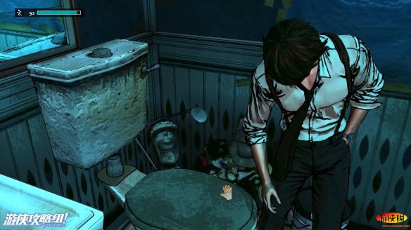 到达马桶前,点击马桶,向下滑动马桶。