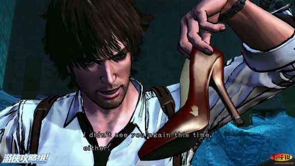 男主坐在了马桶上,拿起地上的高跟鞋。在高跟鞋的背后写着DB两个字母。
