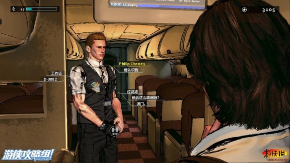 在机舱里带着墨镜,穿着端庄,并且脸的左侧有伤疤的男子就是我们要找的联邦元帅,我们所拿着的徽章主人就是这个人,而联邦元帅的名字里也包含D,在联邦元帅的旁边就是我们要找的快递员安东尼奥,代号兔子。