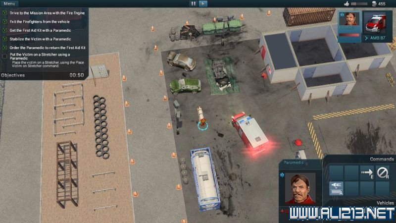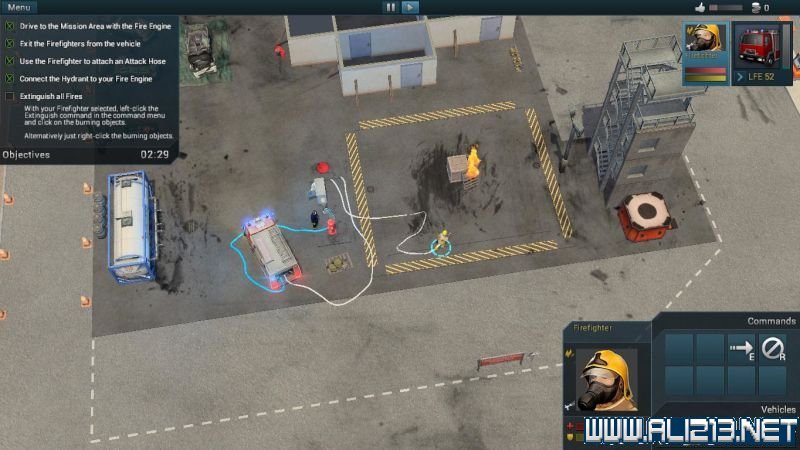 然后点击屏幕右下方的载具命令栏内的“下车(disembark)”按钮,将消防员派遣下车。