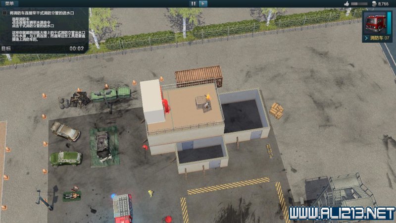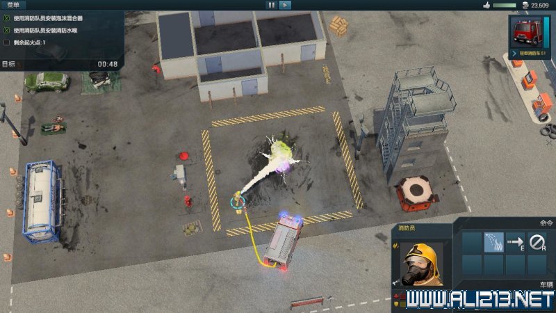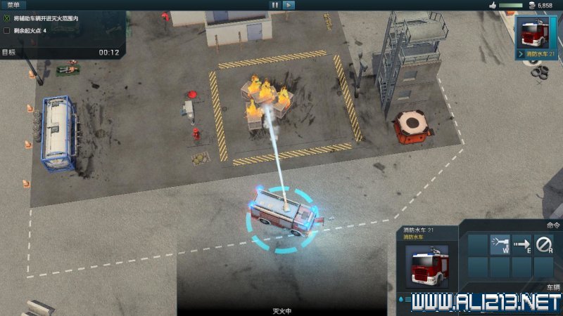 step1.将辅助车辆开进灭火范围内,辅助车辆可以使用它们强力的转台水枪扑灭大火,而不需要额外的消防员。