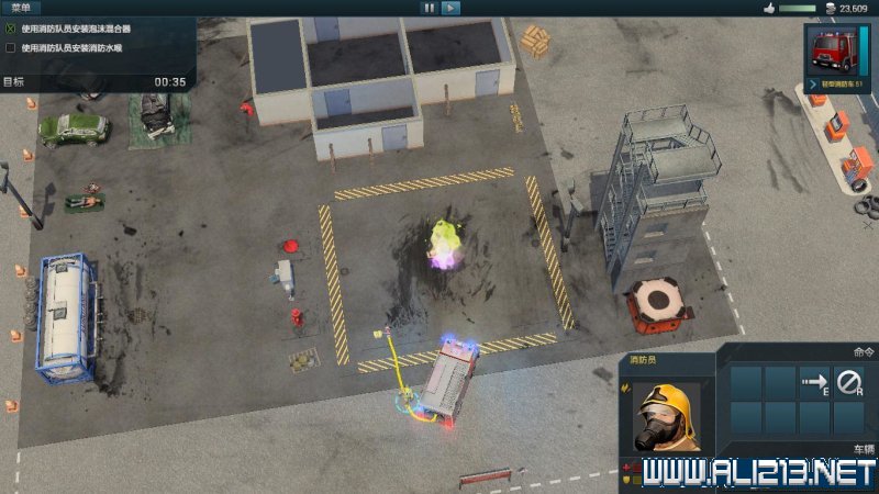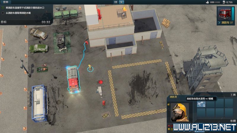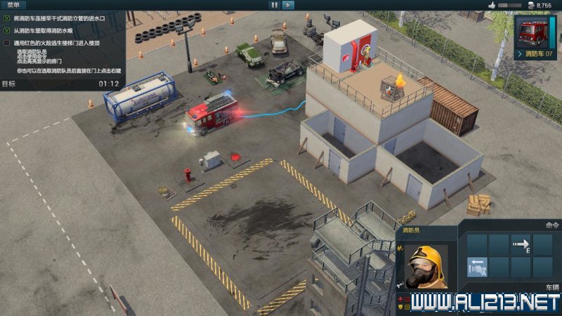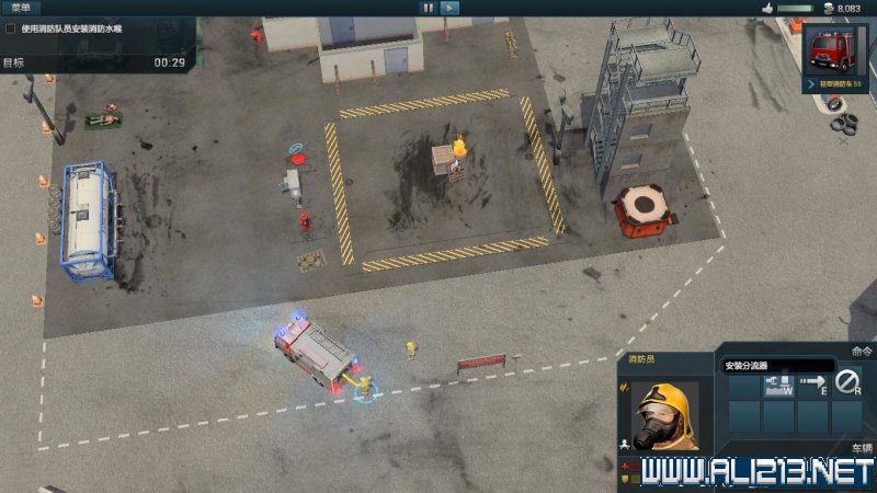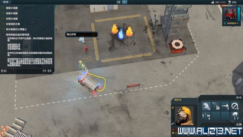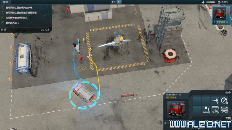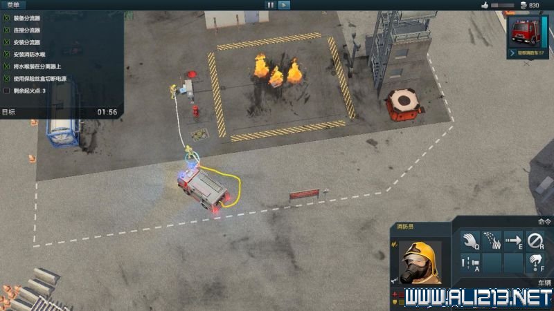随后点击手提着消防软管的消防员,此时消防员命令栏中会出现一个“拼接”的命令,将软管拼接到消防车上。