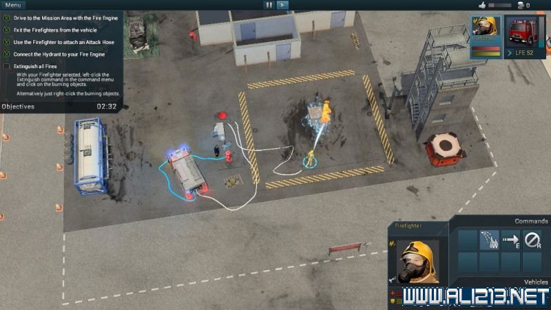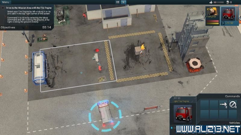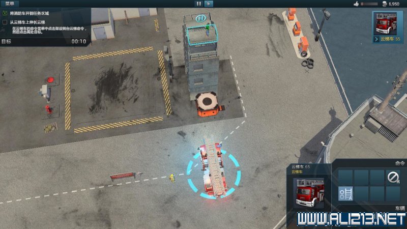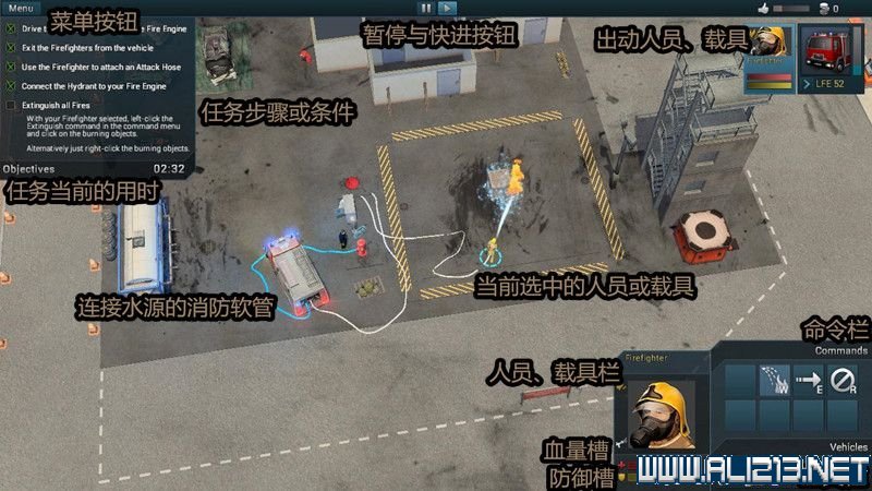 游戏画面:被点选的人员或载具,在其身边会出现一个浅蓝色的光圈,如果是连接水源的消防软管,会显示为浅蓝色。