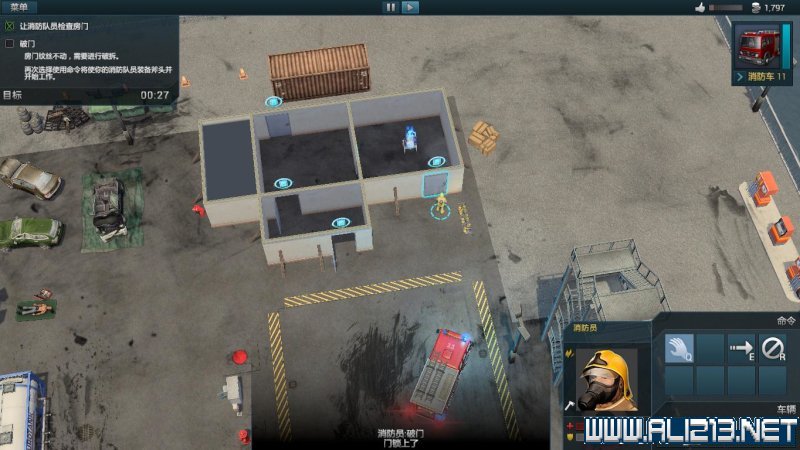 选取消防员,点击使用命令,点击火险逃生楼梯门,玩家也可以在选择消防队员后直接在门上点击右键。