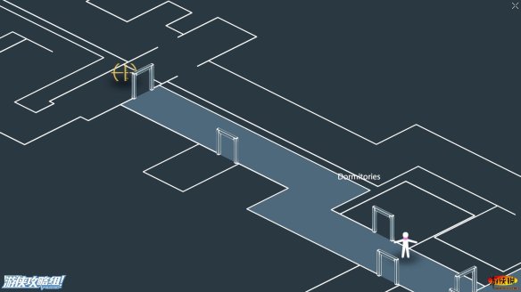 本区域也有一名守卫, 他的巡逻路线如图所示。巡逻路线很短,可以先来到比较近的障碍物前蹲伏,之后等待他进房间之时前往后面的障碍物,再一次等待他离开之后进入后面的门。