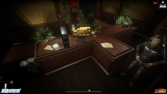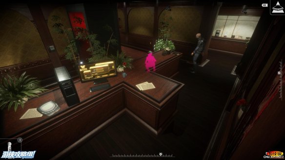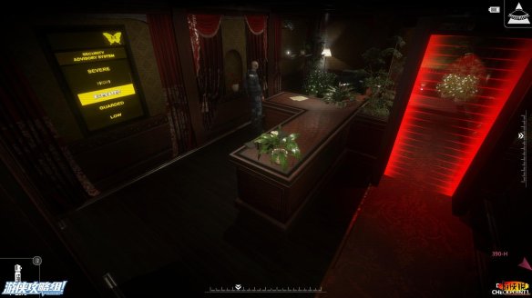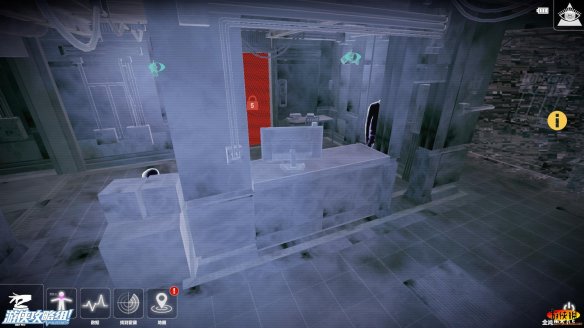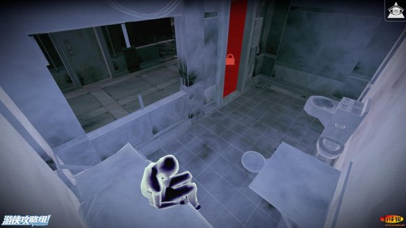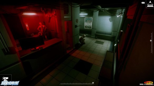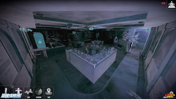 视角切换到里面房间的摄像头上。可以看到一名巡逻的卫兵。此时有两瓶喷雾剂,可以直接喷晕卫兵,也可以稳妥的绕过他。